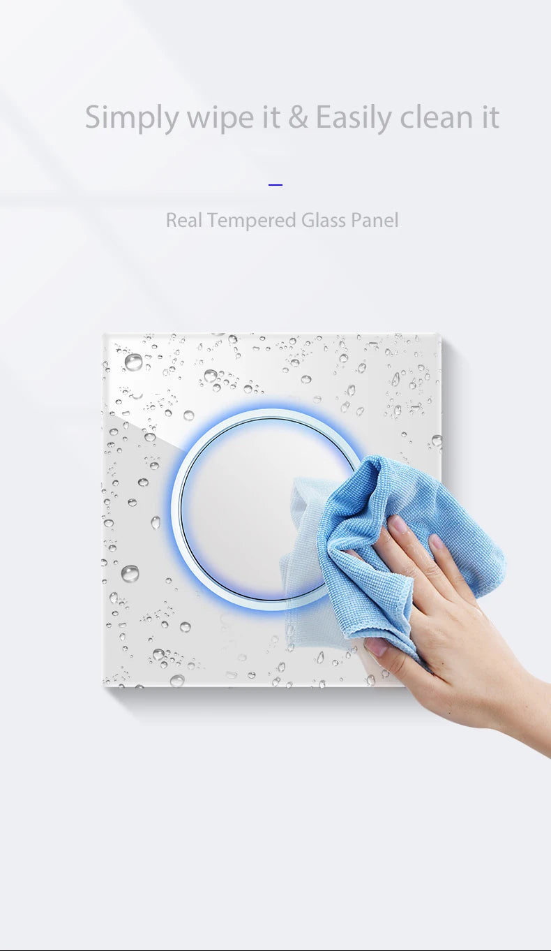 Give your interior a modern upgrade with the Wallpad glass light switch . This premium panel with a round design and subtle blue LED indicator combines style, safety, and ease of use . Suitable for 1-, 2-, 3-, and 4-way switching and designed with high-quality copper components for durable performance.