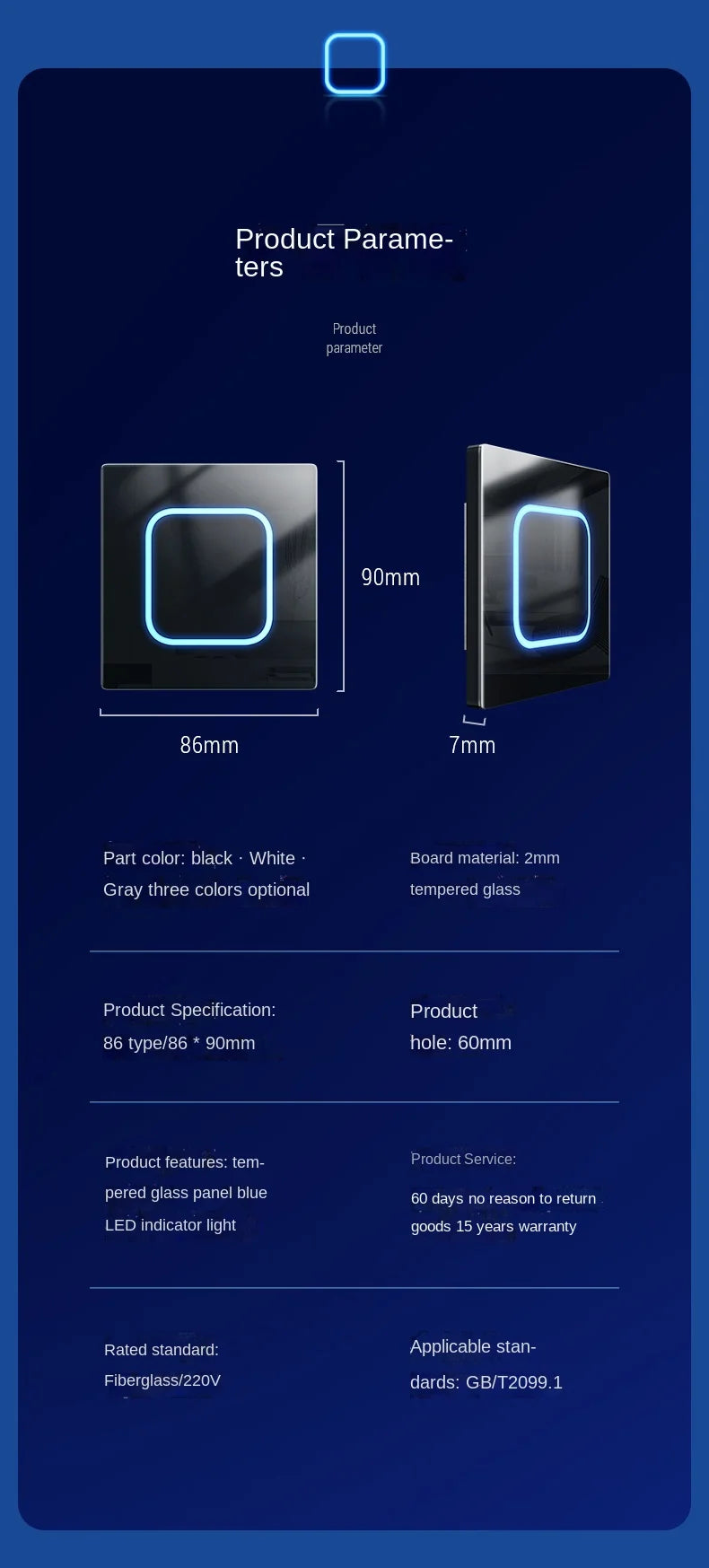 Geef je interieur een moderne en luxe uitstraling met de Depo Guye glazen lichtschakelaar. Dit stijlvolle touchpaneel is verkrijgbaar in 1-, 2-, 3- en 4-gang uitvoeringen en voorzien van een subtiele LED-indicator. Geschikt voor universele aansluiting en eenvoudig te installeren.