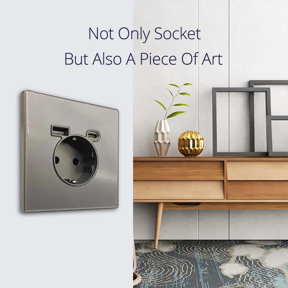 Upgrade je interieur met het Wallpad EU stopcontact met geïntegreerde USB-C-oplaadpoort. Laad eenvoudig je smartphone, tablet of laptop direct op via de 5V/3.1A USB-C terwijl je ook het standaard stopcontact gebruikt. Het stijlvolle gepaneelde design van gehard glas geeft je woning een moderne, luxe uitstraling.
